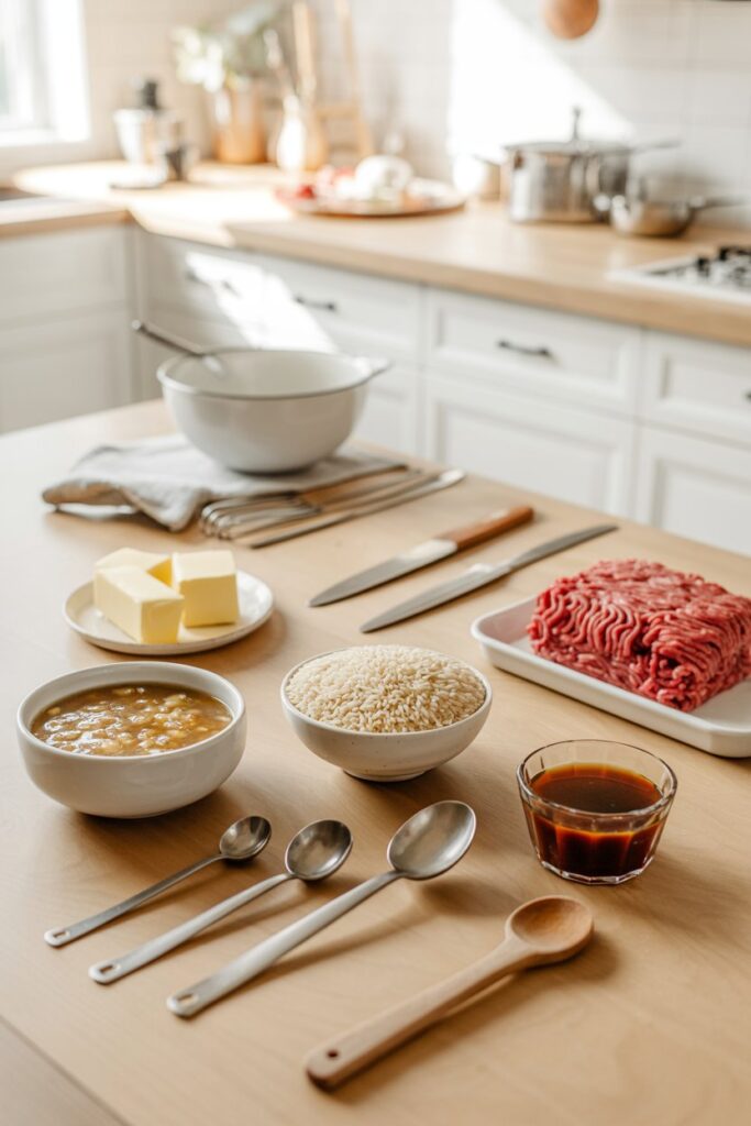 - Layer Beef and Rice: Spread the cooked, drained ground beef evenly in the bottom of the prepared baking dish. Sprinkle the uncooked rice evenly over the beef.