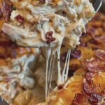 - Combine Casserole Base: In a large mixing bowl, combine the shredded chicken, chopped bacon, and half of the shredded cheddar cheese (¾ cup). Pour the ranch sauce over the top and stir until everything is evenly coated.
