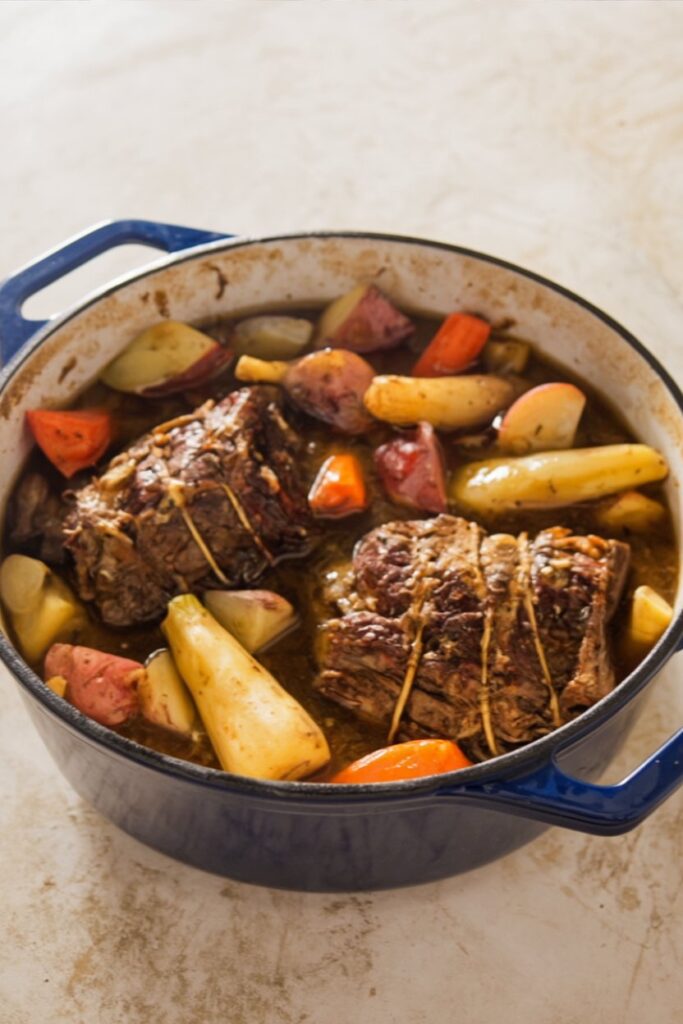 Place the lid back on and return the covered pot to the oven. Cook for another 1 to 1½ hours. The pot roast is done when both the meat and the vegetables are very tender when pierced with a fork.